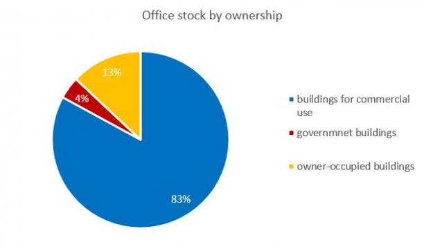 In terms of ownership structure, approximately 4% of the office stock is state-owned, 13% are buildings owned and fully occupied by the same entity, and the total stock for commercial use remains at 83% (or around 1.6 million sq m) of total modern office stock in Bratislava.