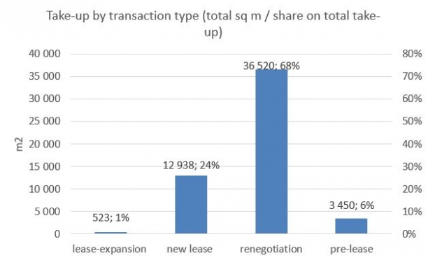 The largest transaction in the third quarter was the renegotiation of 12,000 sq m of office space within the manufacturing / construction sector. In addition, a further 15 transactions with an area of more than 1,000 sq m and 13 transactions ranging from 500 to 1,000 sq m were recorded.
