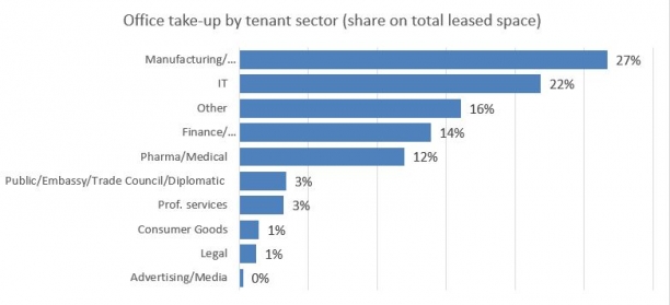 The majority of leased spaces this quarter were let to manufacturing / construction sector (27%), followed by the IT sector (22%) and unclassified sectors (20%).