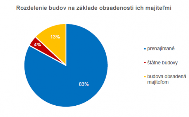 Pokiaľ ide o vlastnícku štruktúru, približne 4% budov sú vo vlastníctve štátu a ďalších 13% sú budovy, ktoré sú vlastnené a plne obsadené tou istou entitou. Celkové zásoby na komerčné využitie zostávajú na 83% z celkových moderných kancelárskych priestorov v Bratislave (alebo okolo 1,6 mil. m2).