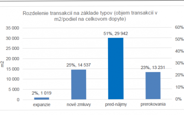 Nájomné transakcie dosiahli v prvom štvrťroku 2021 celkovú výmeru cca. 58.700 m2, čo predstavuje 128% nárast prenajatých plôch v porovnaní s rovnakým štvrťrokom minulého roka. Nové nájmy predstavujú 25 %, prerokovania súčasných nájmov 23 %, pred-prenájmy 51 % a expanzie predstavovali 2 % všetkých transakcií.