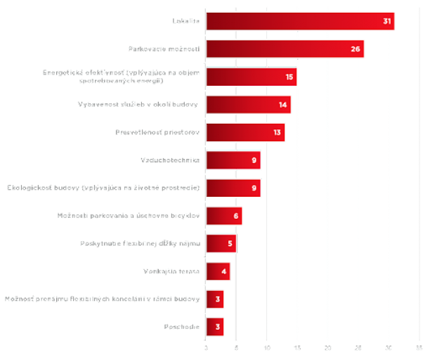 Okrem ceny, zohráva veľmi dôležitú rolu, pri rozhodovaní o kancelárskych priestoroch aj lokalita. Na druhej priečke to je možnosť parkovacích miest a tretiu priečku dôležitosti zastupuje energetická efektívnosť. Nie je prekvapujúce, že s modernými trendmi a aktuálnou spoločenskou situáciou je práve energetická úspornosť v top troch najdôležitejších parametroch.