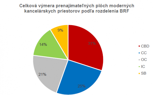 Pokiaľ ide o vlastnícku štruktúru, približne 4% budov sú vo vlastníctve štátu a ďalších 13% sú budovy, ktoré sú vlastnené a plne obsadené tou istou entitou. Celkové zásoby na komerčné využitie zostávajú na 83% z celkových moderných kancelárskych priestorov v Bratislave (alebo okolo 1,6 mil. m2).