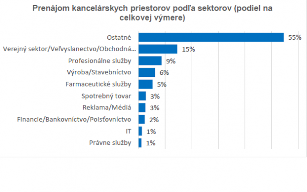 Väčšina prenajatých priestorov v tomto štvrťroku bola prenajatá v rámci sektora Ostatné (55%), nasleduje verejný sektor, veľvyslanectvo, obchodná komora a diplomacia(15%) a sektor profesionálnych služieb (9%).