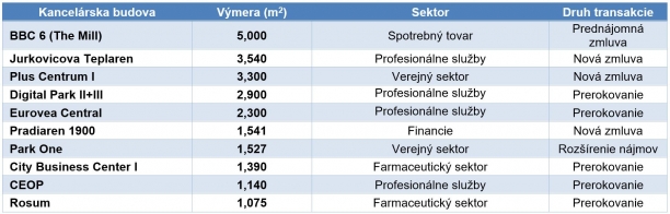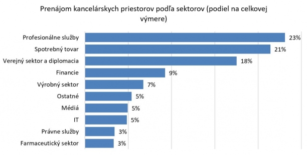 Väčšina prenajatých priestorov v tomto štvrťroku bola prenajatá v rámci profesionálnych služieb (23 %), spotrebného tovaru   (21 %), a vo verejnom sektore (18 %). Za zmienku stojí porovnanie prvých troch kvartálov v rokoch 2020 a 2021 kde evidujeme 27% nárast celkovej nájomnej aktivity (office take-up), zatiaľ čo novoprenajaté plochy (celková nájomná aktivita bez prerokovaní) zaznamenali nárast až 79%.